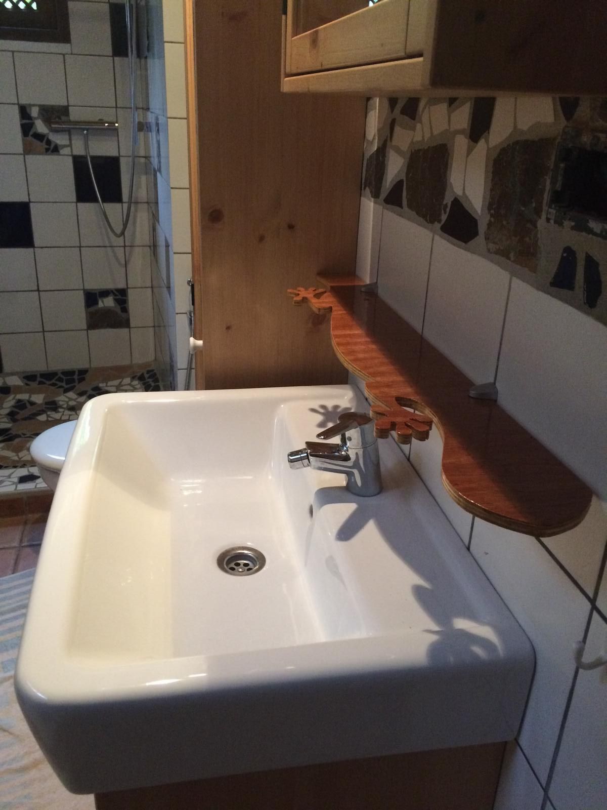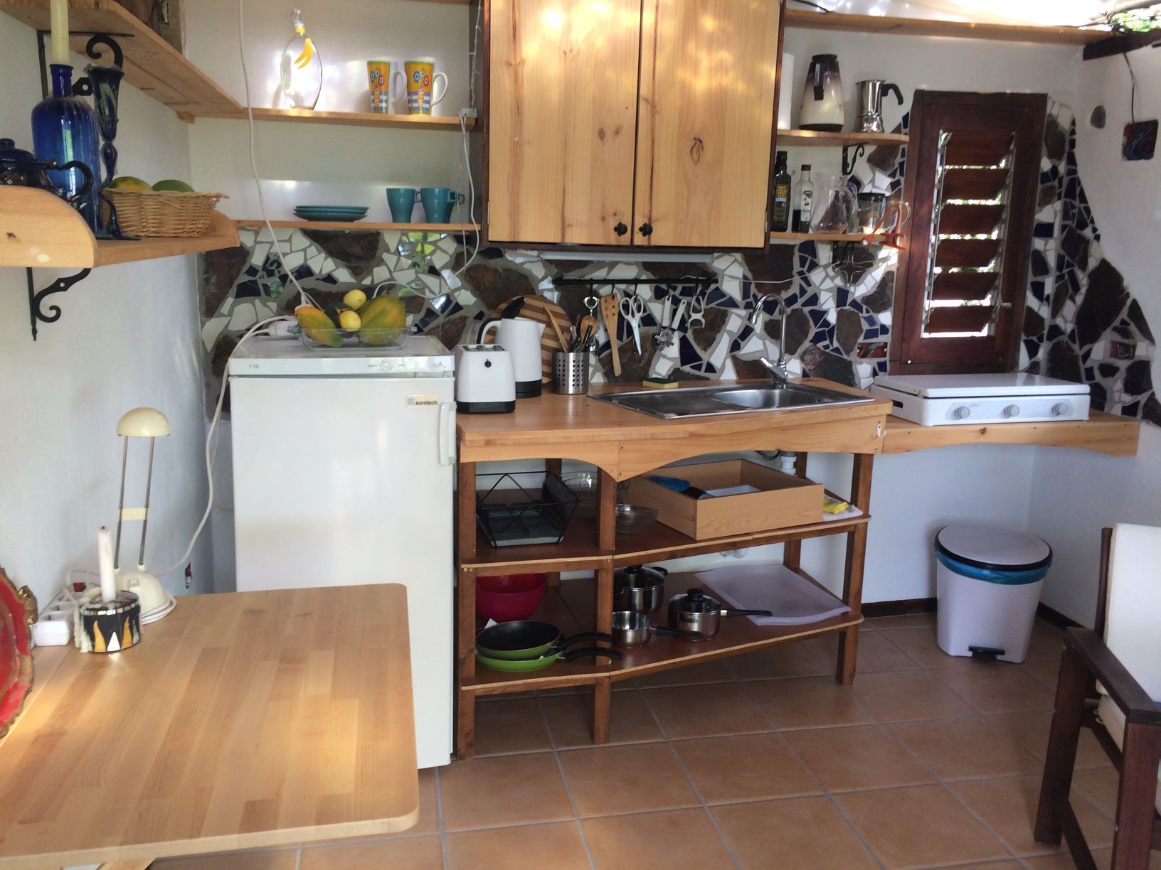 - Küchenzeile: Grundausstattung, Gasherd, Kühlschrank, Toaster, Wasserkocher, Isolierkanne mit Kaffeefilter, Geschirrtücher, Spülmittel u. -schwämmchen, Wasserfilter (kein Trinkwasser schleppen mehr)